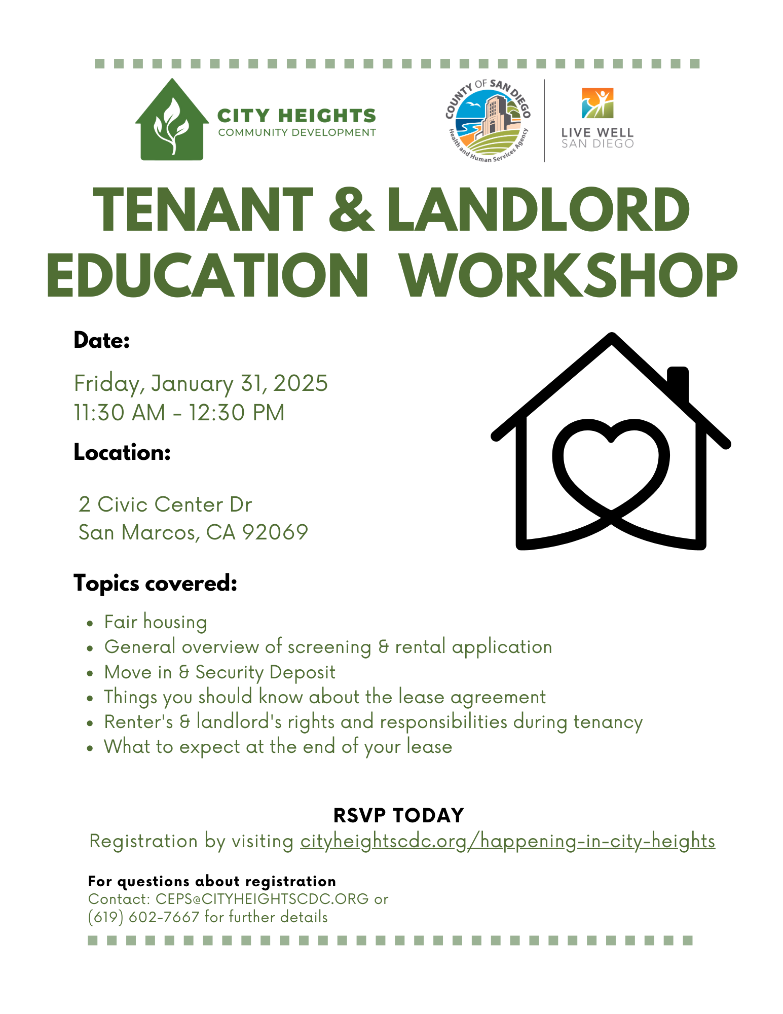 We invite you to join our Coordinated Eviction Prevention Systems team for a Tenant and Landlord Education Workshop in San Marcos. This workshop provides a general overview of the rights and responsibilities of tenants and landlords. We will cover valuable information about the documents required when applying for a rental unit and an overview of the rental process from beginning to end.